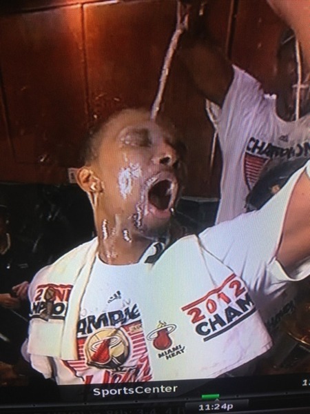 LOL, did anyone else see Chris Bosh & his "champagne celebration" after winning the title? when i saw that live i was like wth... did i just see what i thought i did? then i saw this pic on twitter + the animated gifs/vids... yeah...
